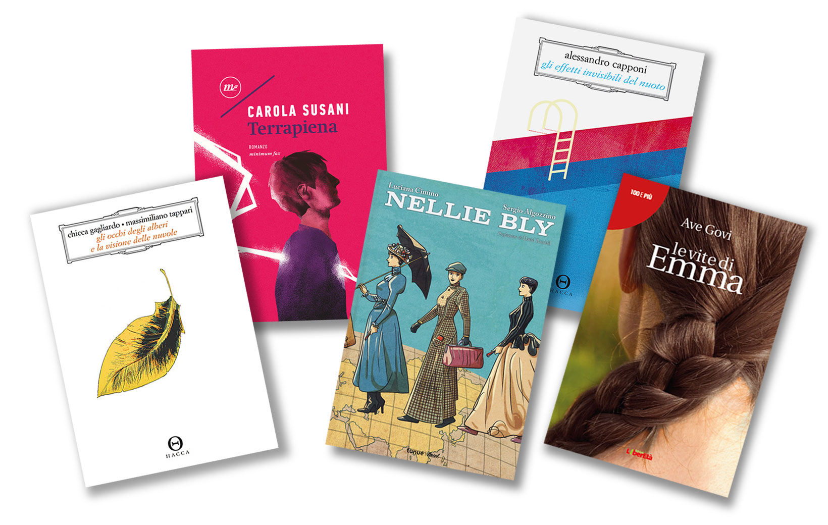 Abbiamo voluto puntare su titoli freschi di stampa, anzi freschissimi. Uno di questi uscirà in libreria in contemporanea con la nostra premiazione: è la raccolta di racconti Gli effetti invisibili del nuoto (Hacca), di Alessandro Capponi. In uscita il 5 marzo 2020 è invece il romanzo di quest’anno, Terrapiena (minimum fax), di Carola Susani. Completano la selezione (all’insegna dell’emancipazione femminile) il graphic novel Nellie Bly (Tunuè), di Luciana Cimino e Sergio Algozzino, e, tra diario e romanzo, Le vite di Emma, di Ave Govi, pubblicato da LiberEtà, casa editrice dello Spi/CGIL, nostra partner nella quarta edizione di Memory Ciak, dedicata come sempre all’incontro tra generazioni sui temi del lavoro e dell’impegno sociale e civile.
